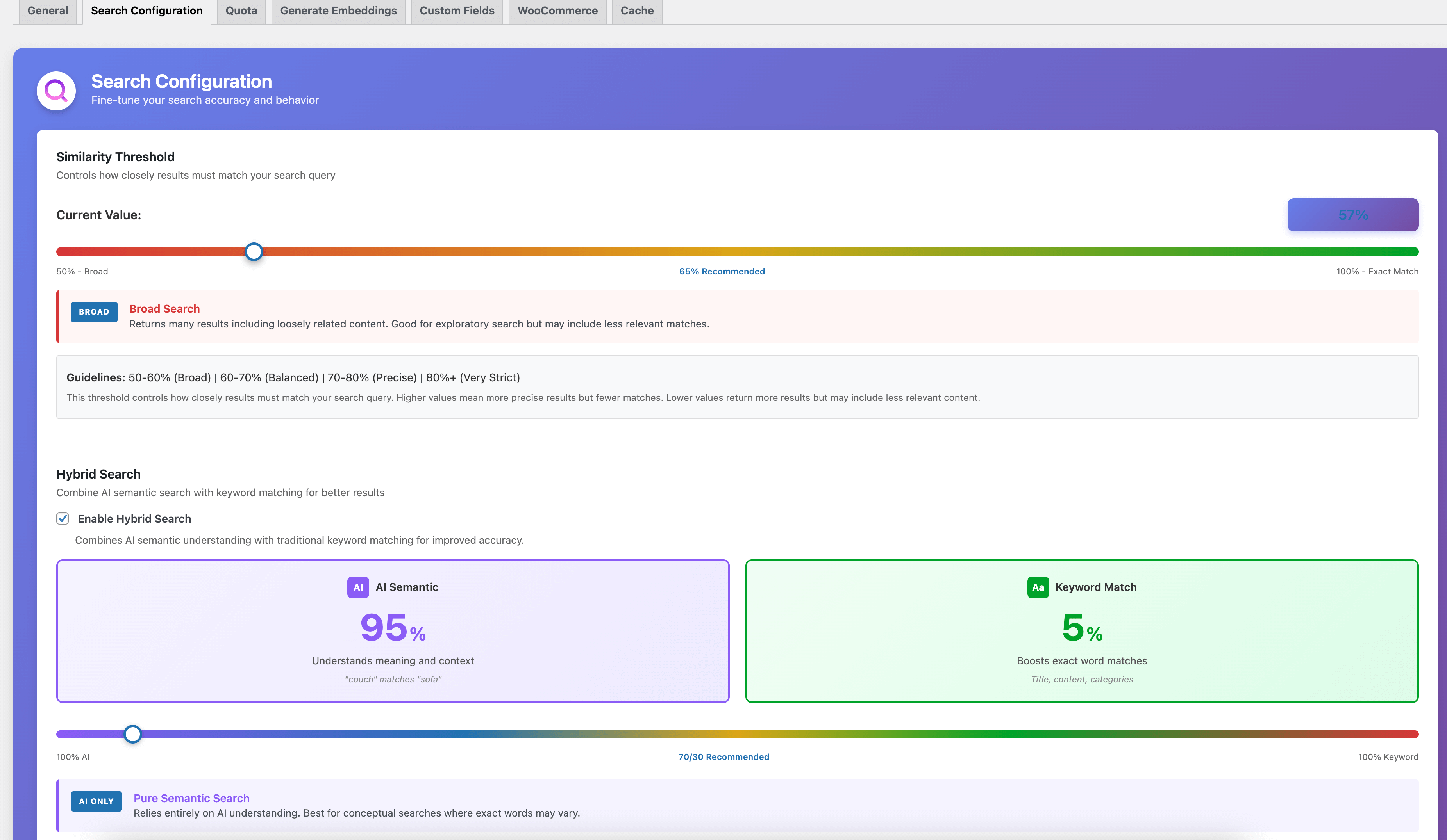 - Configurable Balance Slider: Adjust the weight between AI semantic search (0-100%) and keyword matching