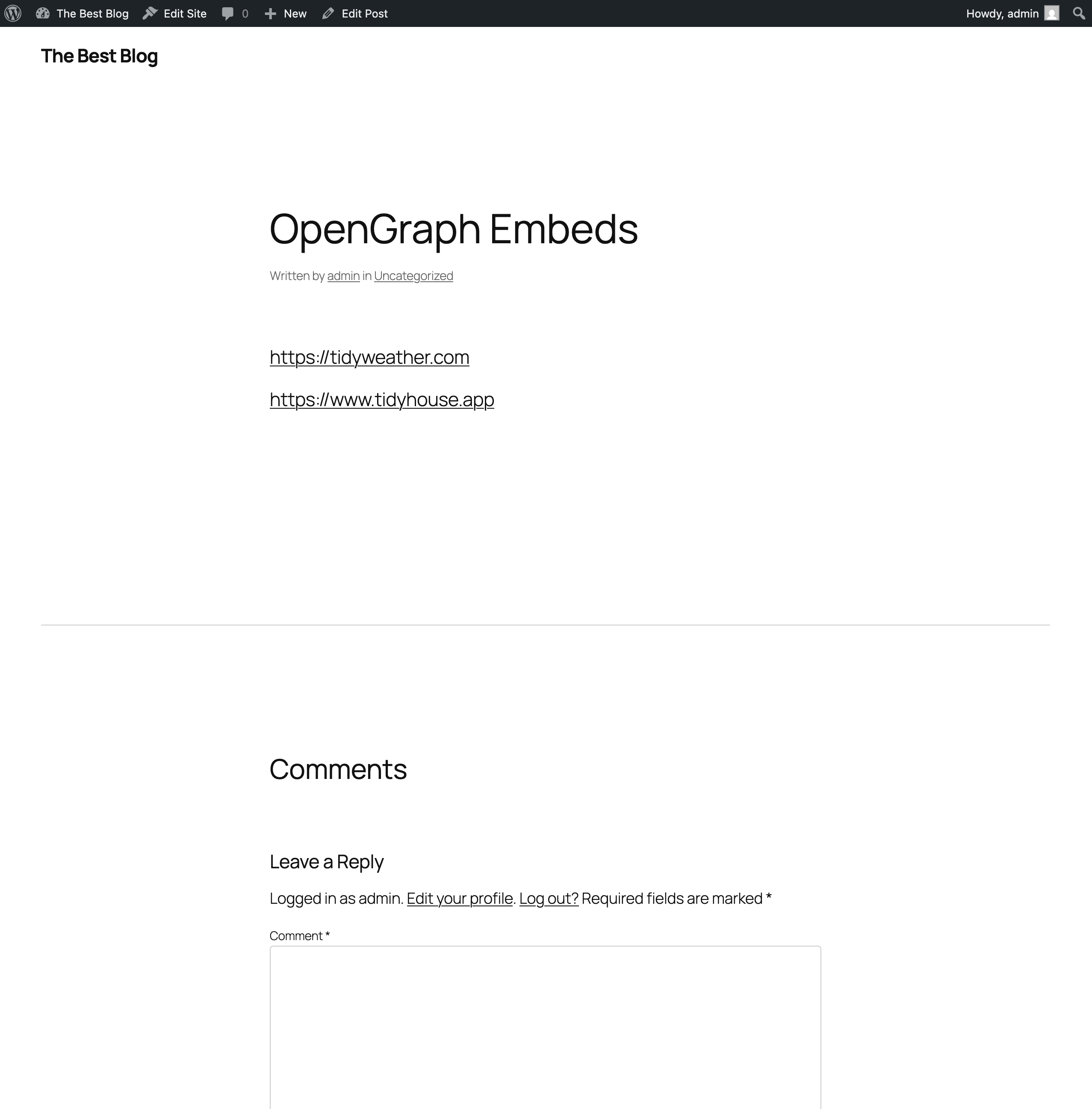 - Auto-embed fallback — When WordPress can’t find an oEmbed provider for a URL pasted on its own line, this plugin automatically fetches the page’s OpenGraph tags and renders a card instead of a plain link.